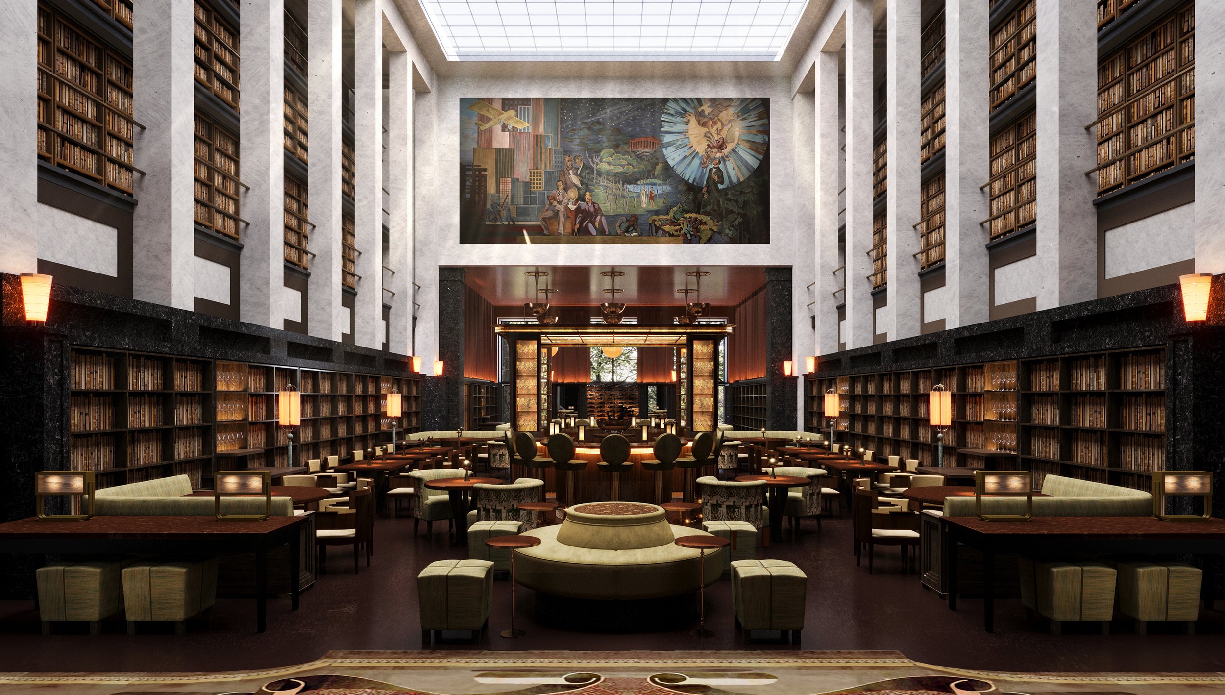 Den gamle hovedutlånssalen i Deichmanske hovedbibliotek fra 1933, hvor tusenvis av bøker fant veien til lesere gjennom generasjoner, blir nå et pulserende rom for mat, kultur og opplevelser. Der utlånsdisken sto, finner du baren - hvor bartenderen «låner deg» for kvelden og serverer historier i stedet for bøker. Her kan du kjenne på byggets historie mens du nyter en drink under takhøyde på hele 16 meter.